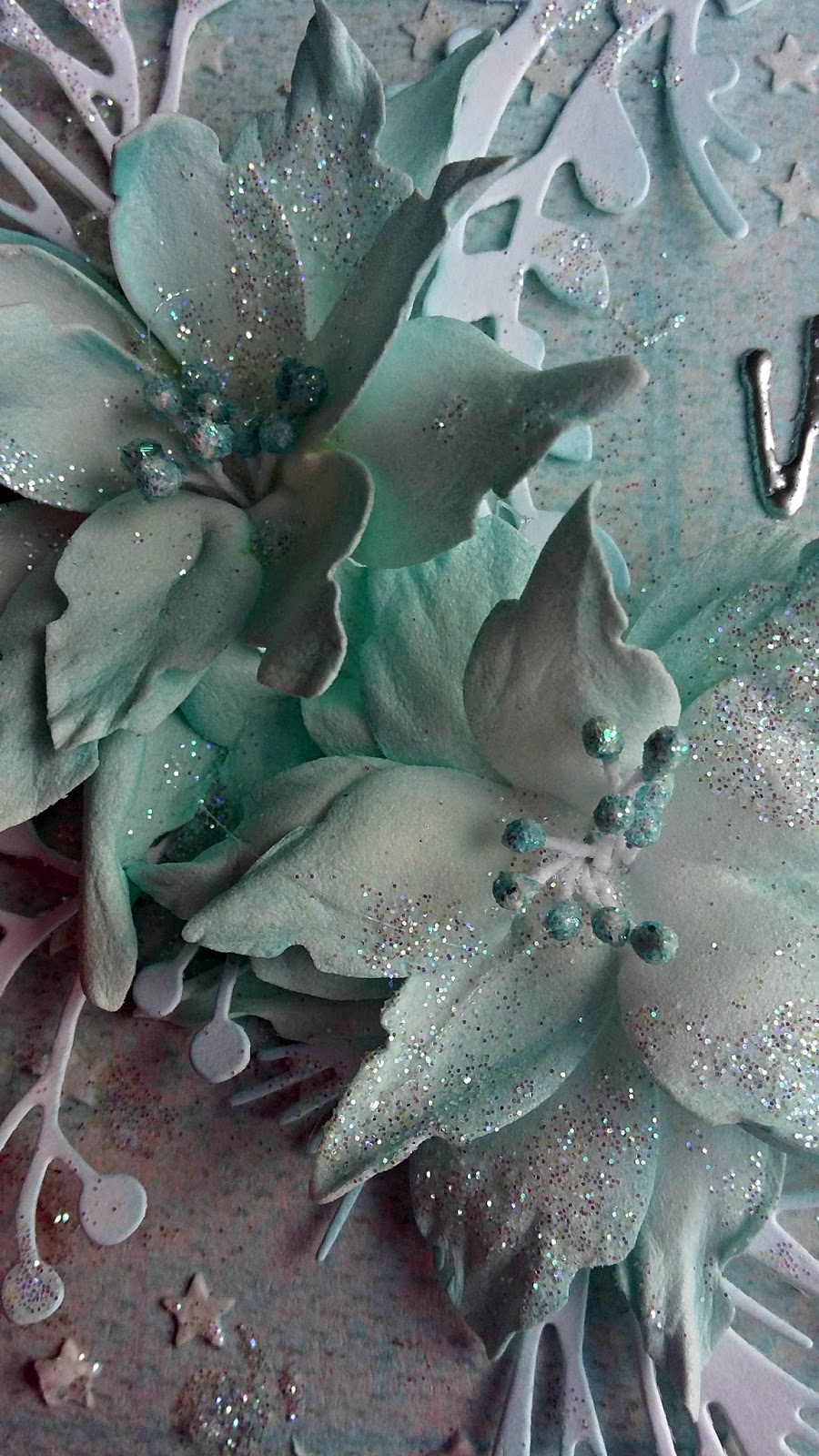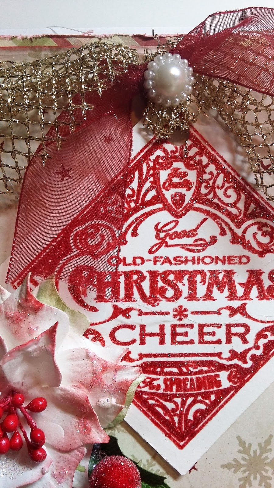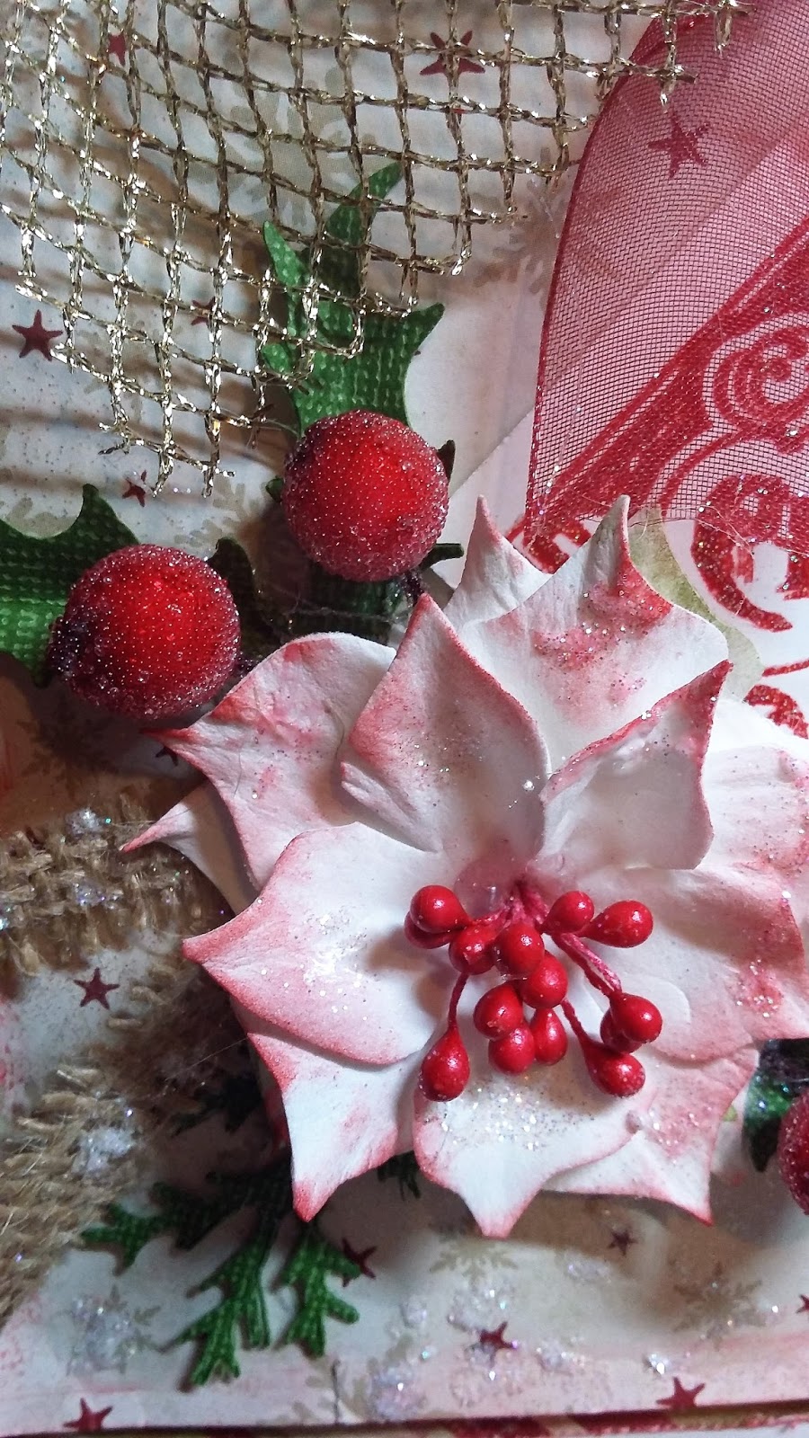 I used a Penny Black stencil and some embossing paste on watercolour paper. When that was dry I misted with some sparkly spray, then used a wet paintbrush to pick up Festive Berries and Peacock Feathers distress inks and add them to the piece. I white embossed the Penny Black sentiment onto some Vellum and die cut a Penny Black poinsettia from some wood effect paper, adding the distress inks to the edges. I then die cut the piece with Penny Black Vintage Frames and added some Nuovo drops.