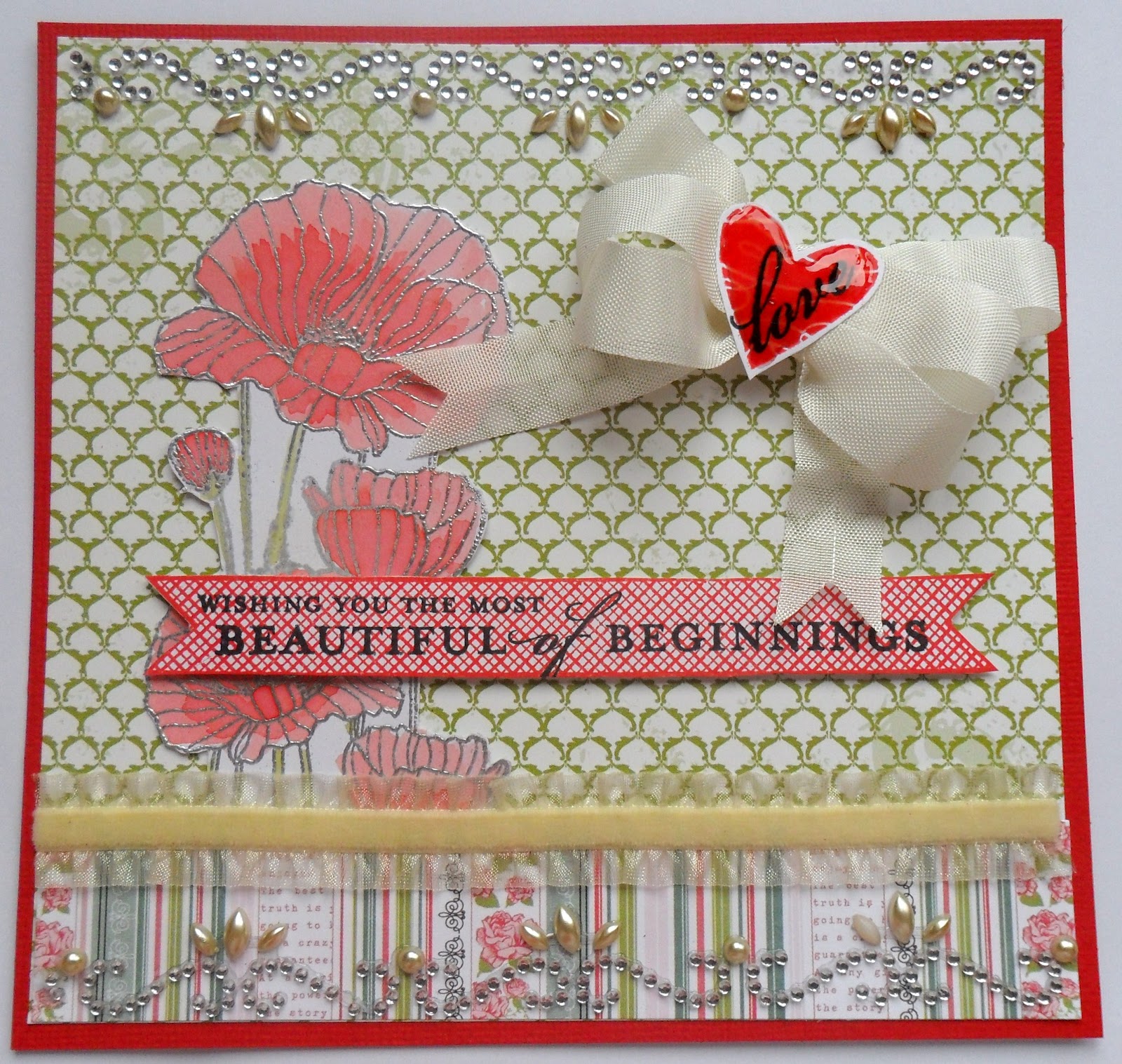 Here's another wedding card I made last night. The banner, sentiment and heart are all from the Simon Says Stamp June card kit. I added Glossy Accents to the heart for a bit of shine. The papers are Echo Park Victoria Garden and the trim and bling are Prima, the bow is seam binding. The poppy stamp is Hero Arts, silver embossed and coloured with Distress Inks.