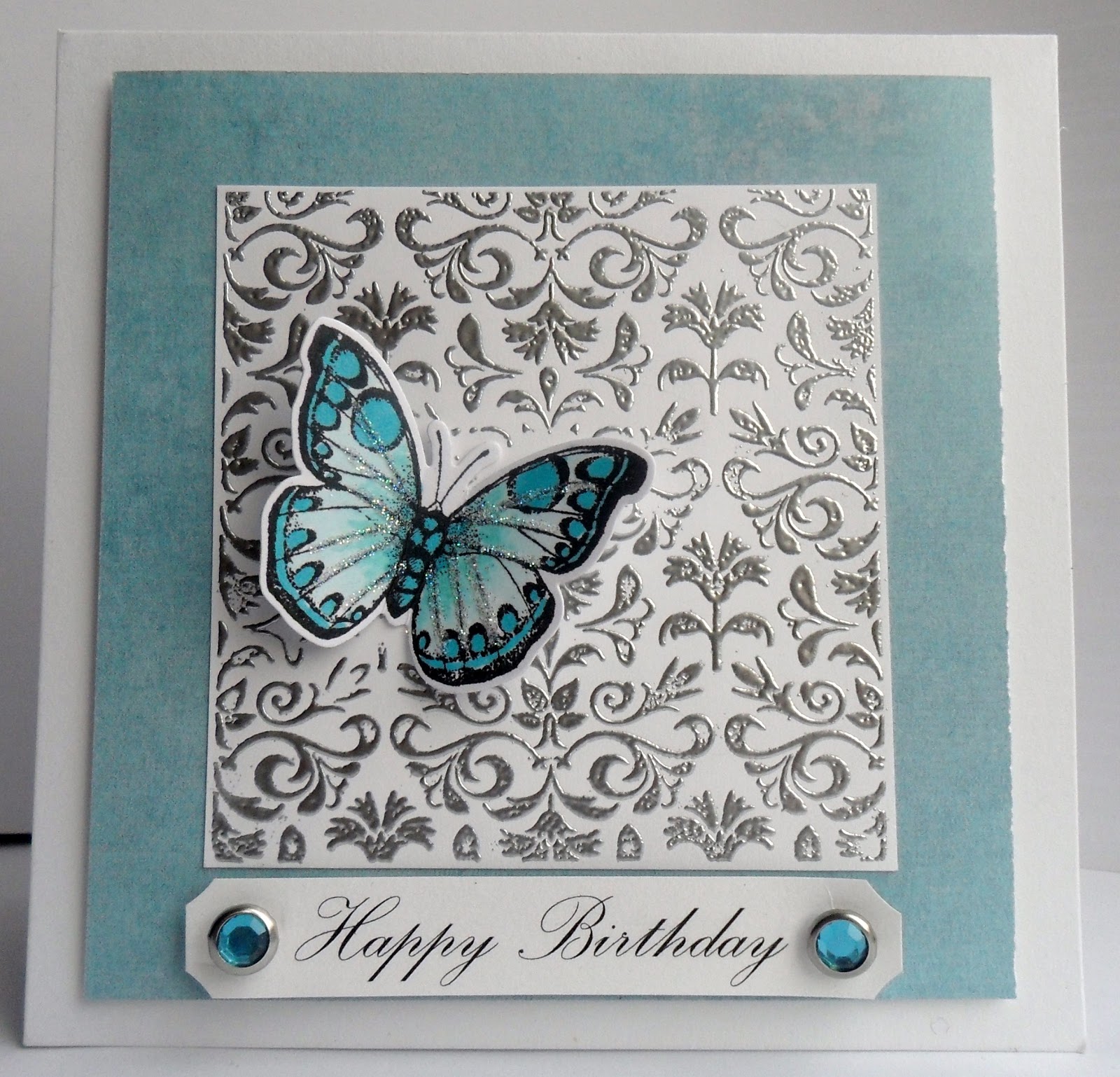 For my card I silver embossed a Hero Arts stamp then used a butterfly from a Hero Arts stamp and die set, coloured with Spectrum Noirs and glittered. I added some pretty blue sparkly brads I've had for ages.
