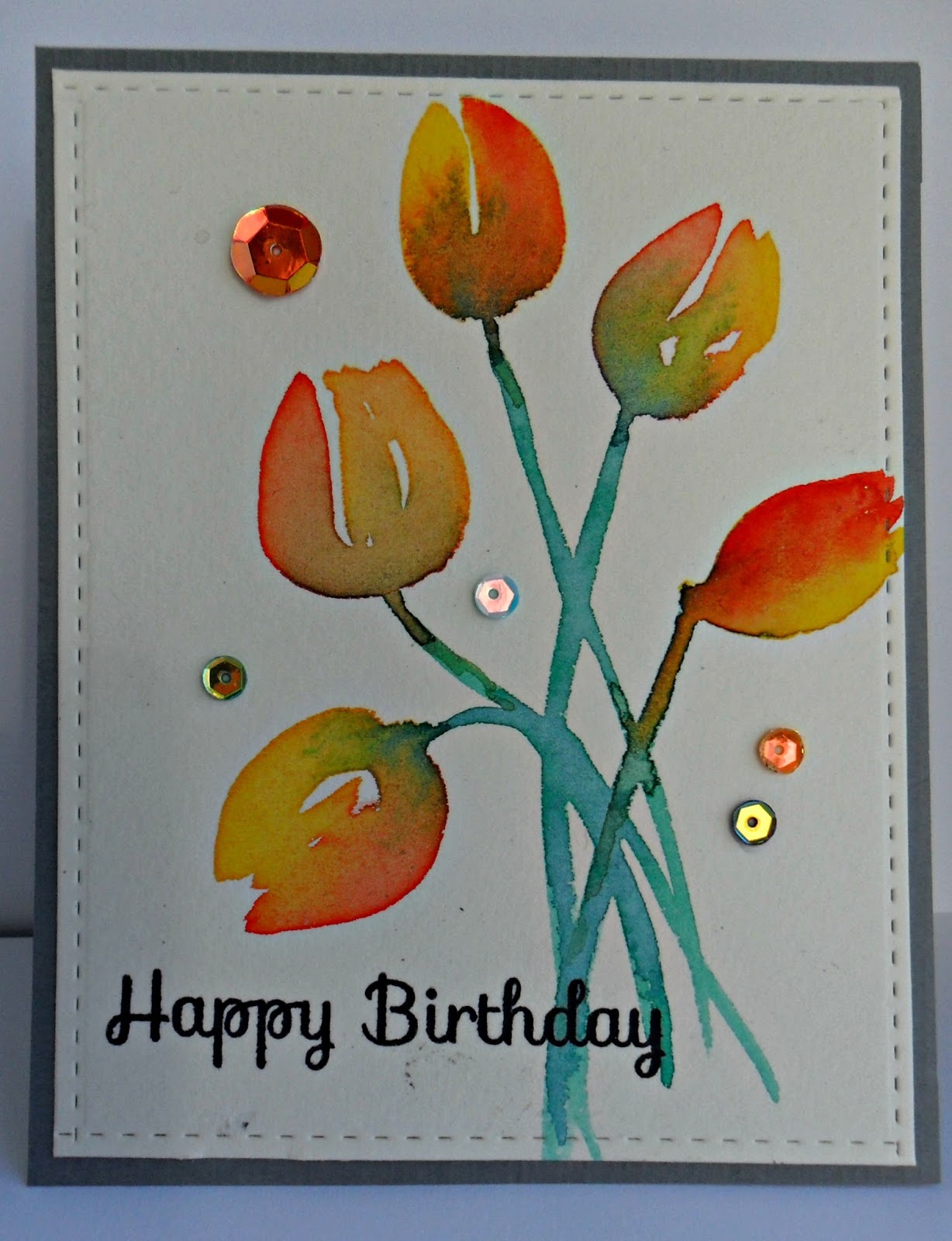 At Simon Says Stamp Wednesday the challenge is One Layer - but we are still allowed some embellishments. I've been practising watercolouring and painted these tulips, cutting out the panel with Simon Says Stamp stitched rectangle and adding some SSS Crystal Reflections sequins and SSS sentiment.